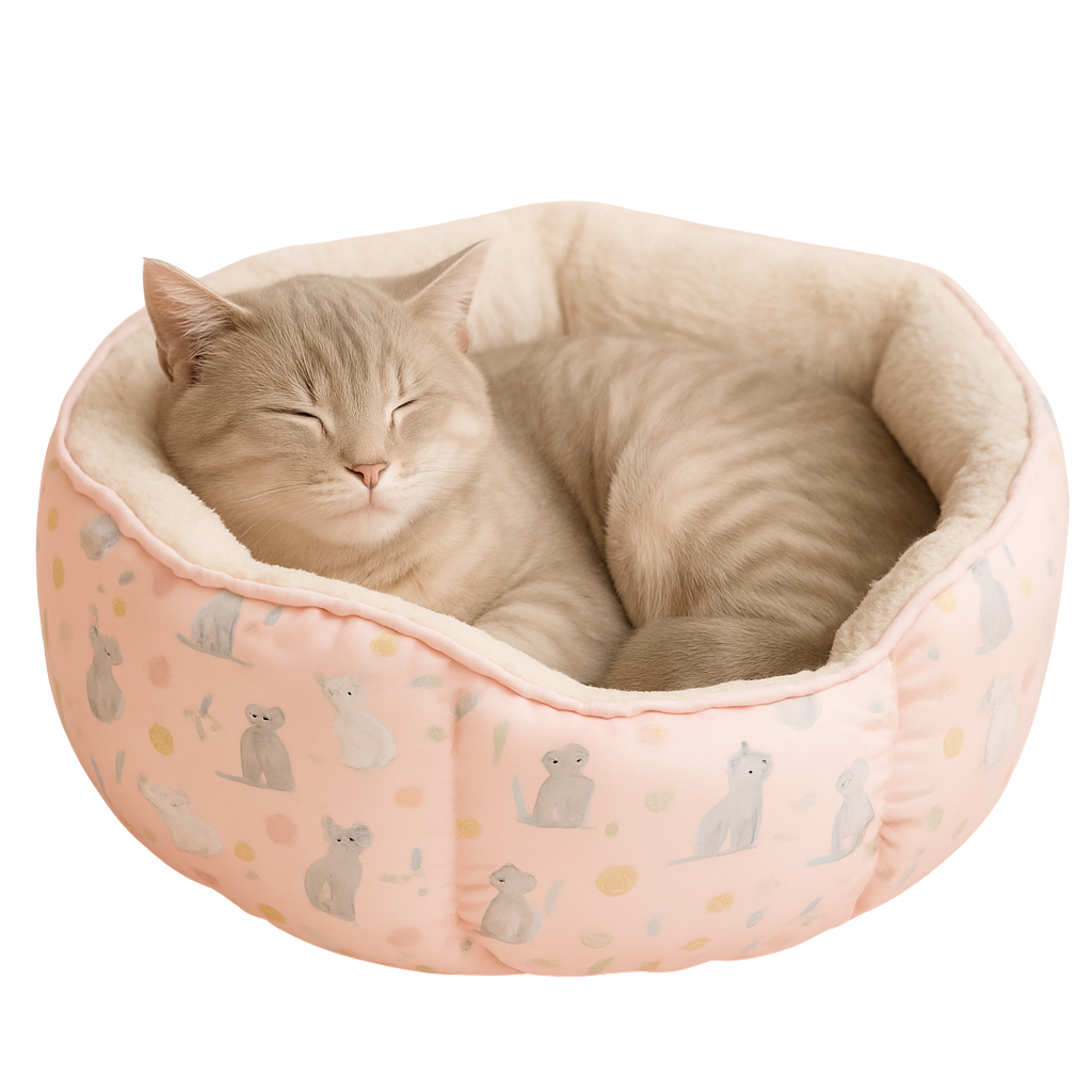 Give your feline the comfort they deserve with this stylish and cozy cat bed. Designed with a pastel pink outer fabric decorated with playful cat prints, it adds a charming touch to any home. The inside is lined with ultra-soft plush material, providing a warm and inviting space for your cat to curl up, nap, and relax.