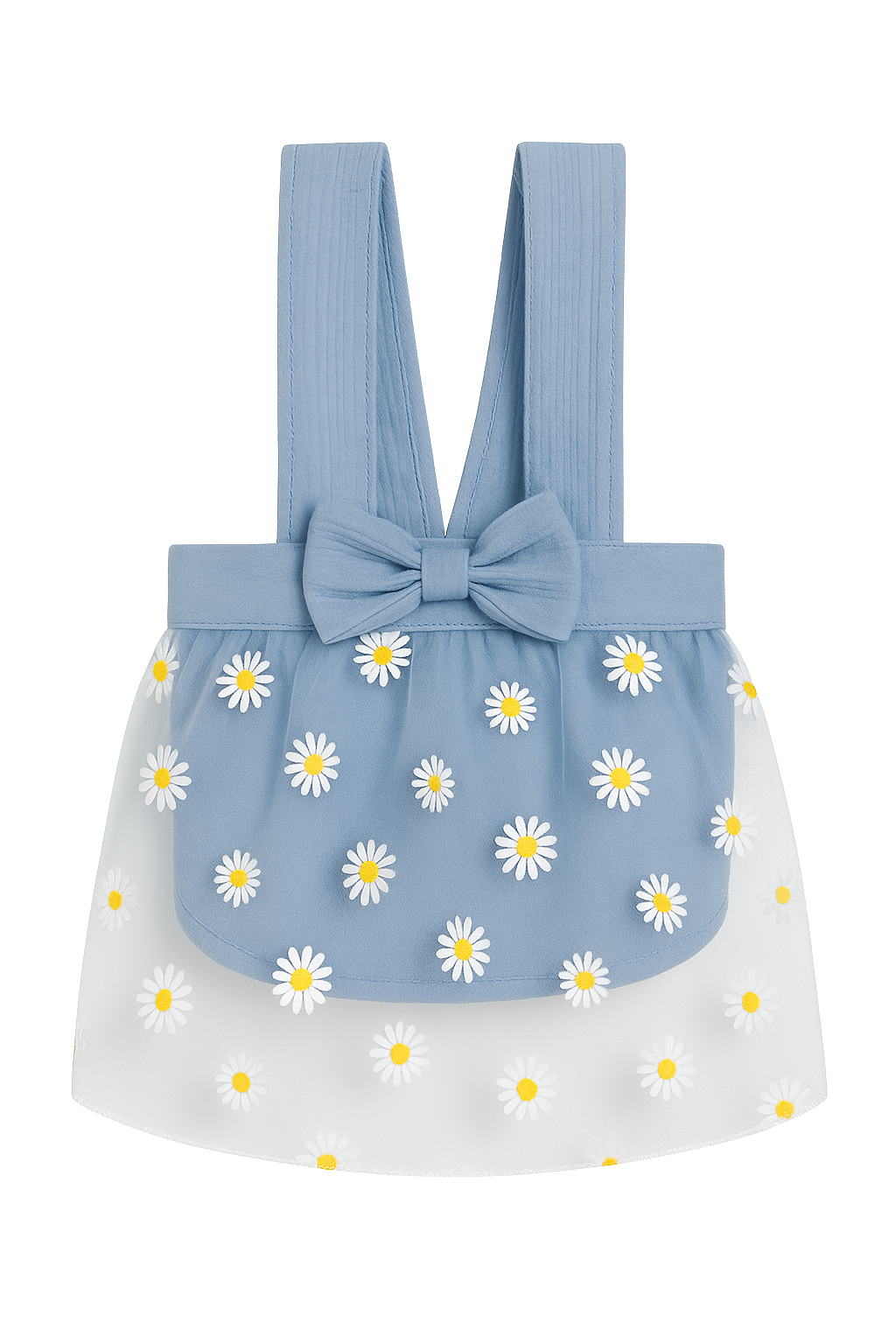 Add a touch of charm to your pup’s wardrobe with this Blue Daisy Dog Dress. Designed in a soft pastel blue with an adorable bow detail, this dress features a delicate sheer overlay adorned with cheerful white and yellow daisies. Perfect for spring outings, photo sessions, or any special occasion, it combines comfort with elegance.