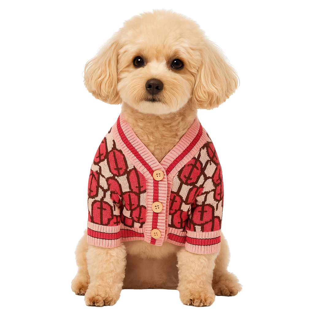 Add a touch of style and comfort to your pup’s wardrobe with this chic knitted sweater. Designed in a soft pink base with bold red and brown patterned details, this cardigan-style piece brings a fashionable flair to any occasion. The button-down front makes it easy to put on and take off, while the ribbed trim ensures a snug yet comfortable fit.