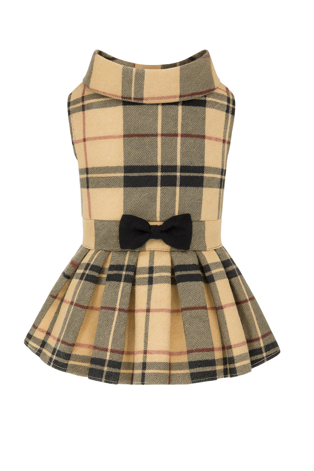 Add a touch of timeless elegance to your pup's wardrobe with this chic plaid dog dress. Designed with a classic beige, black, and red checkered pattern, this dress is perfect for stylish outings, special occasions, or everyday fashion. The dress features a pleated skirt for extra charm and a cute black bow at the waist, creating a sophisticated yet adorable look.