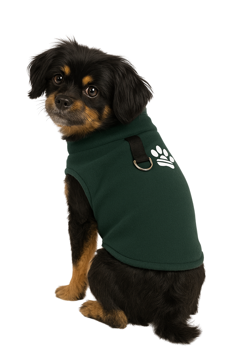 Keep your pup warm and stylish with this soft green fleece dog jacket. Designed for comfort and functionality, it features a lightweight yet cozy fabric that provides warmth without restricting movement. The built-in D-ring makes it easy to attach a leash, offering convenience for walks while eliminating the need for an additional harness.